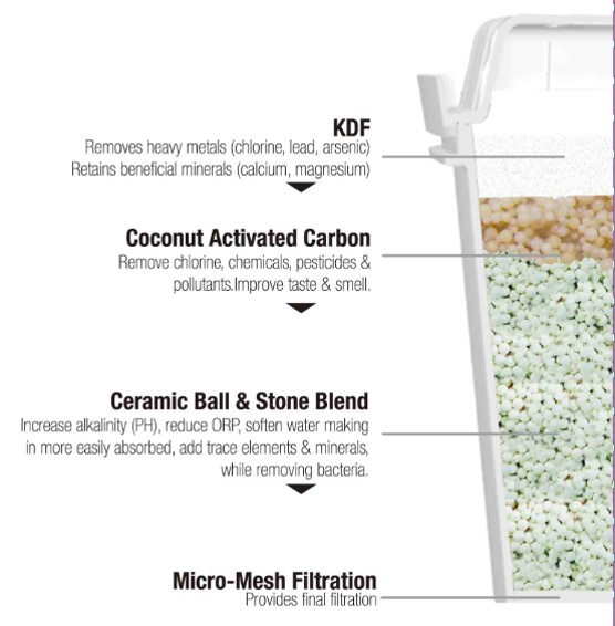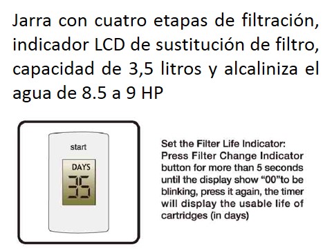 JARRA CON CUATRO ETAPAS DE FILTRACIÓN, INDICADOR LCD DE SUSTITUCIÓN DE FILTRO, CAPACIDAD DE 3,5 LITROS Y ALCALINIZA EL AGUA DE 8.5 A 9HP